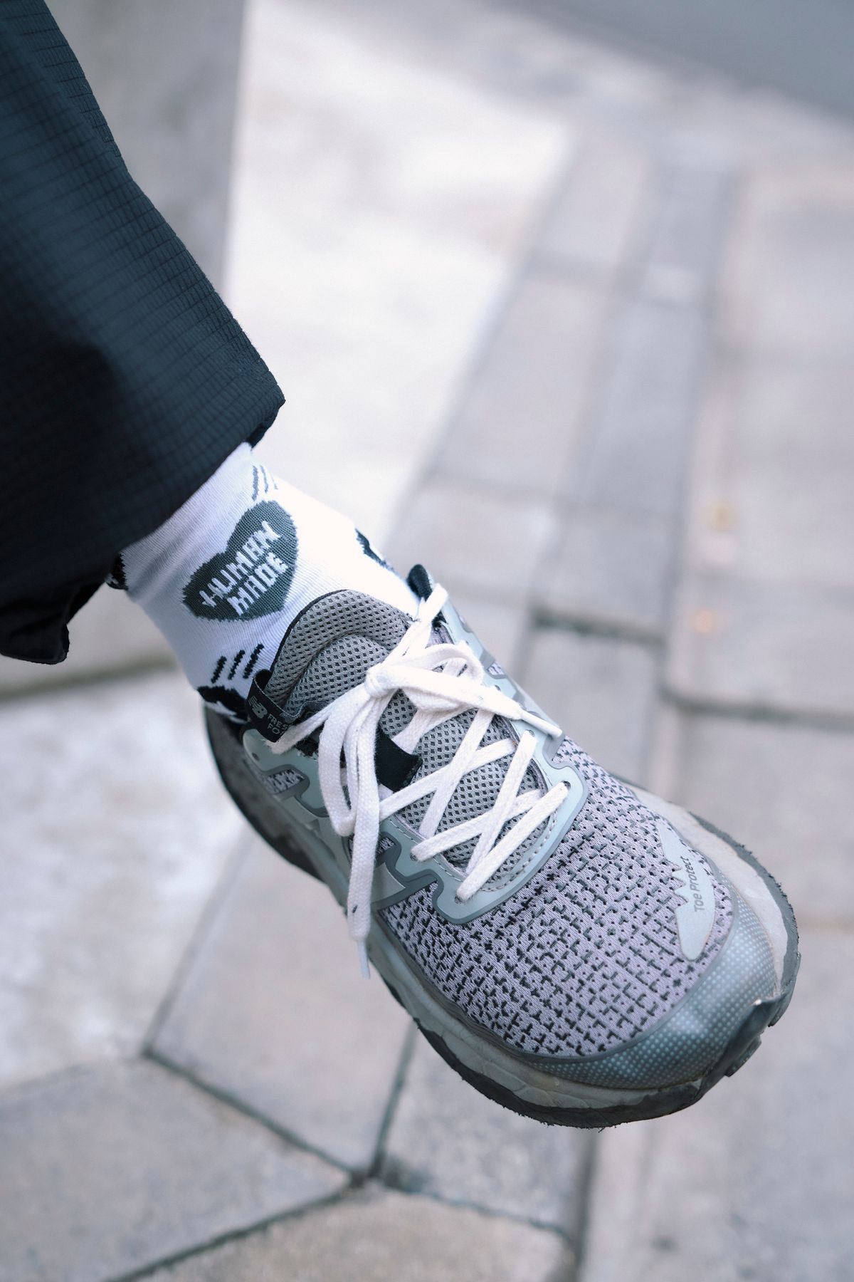 そのジャケットのテックな質感を筆頭に、カーディガンの柔らかさ、パンツの格子状の生地感など多彩な黒を組み合わせた点も白眉。締めは、白T&ニューバランスで軽快に。