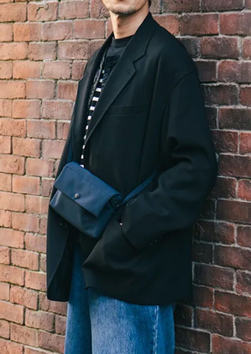 インナーにはあえて単色ではなくボーダー柄で品良く遊び、足元は気分のテック系スニーカーで心地良く&気分良く。ミニバッグの使い方も自然体かつ洒脱。全方位サマになる。