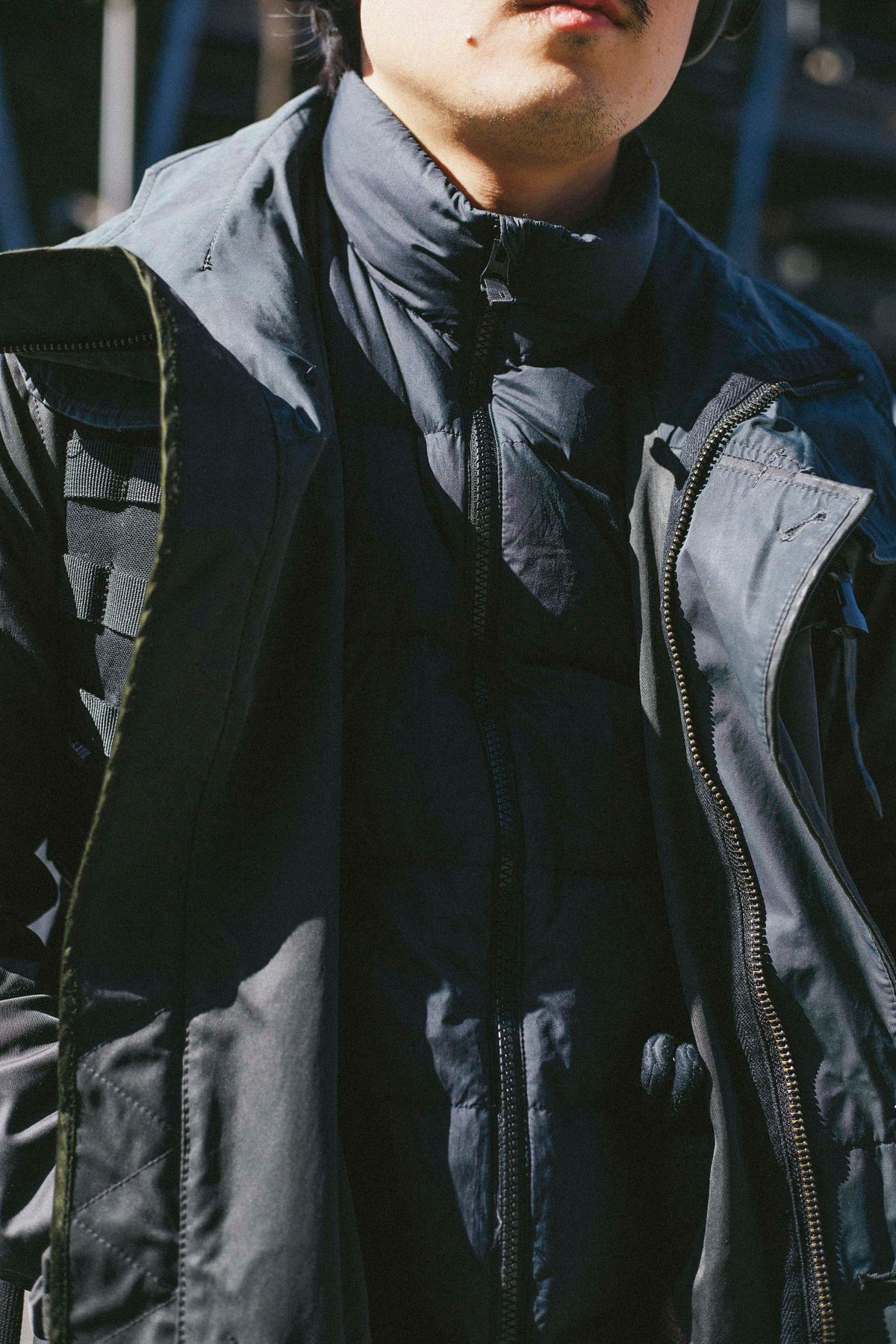 機能重視のギアアイテムとしてユニクロを捉え、ミリタリー特有の重厚さを軽快に裏切る。ダークトーンでまとめつつも、ディテールへのこだわりが光るスタイルだ。