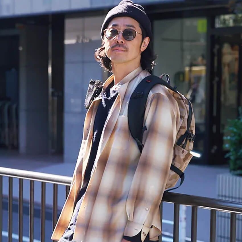 シャツ=ザ リラクス Tシャツ=ラキネス パンツ=コッキ シューズ=フットザコーチャー 帽子=ヨウジヤマモト×ニューエラ バッグ=ヨロズ
