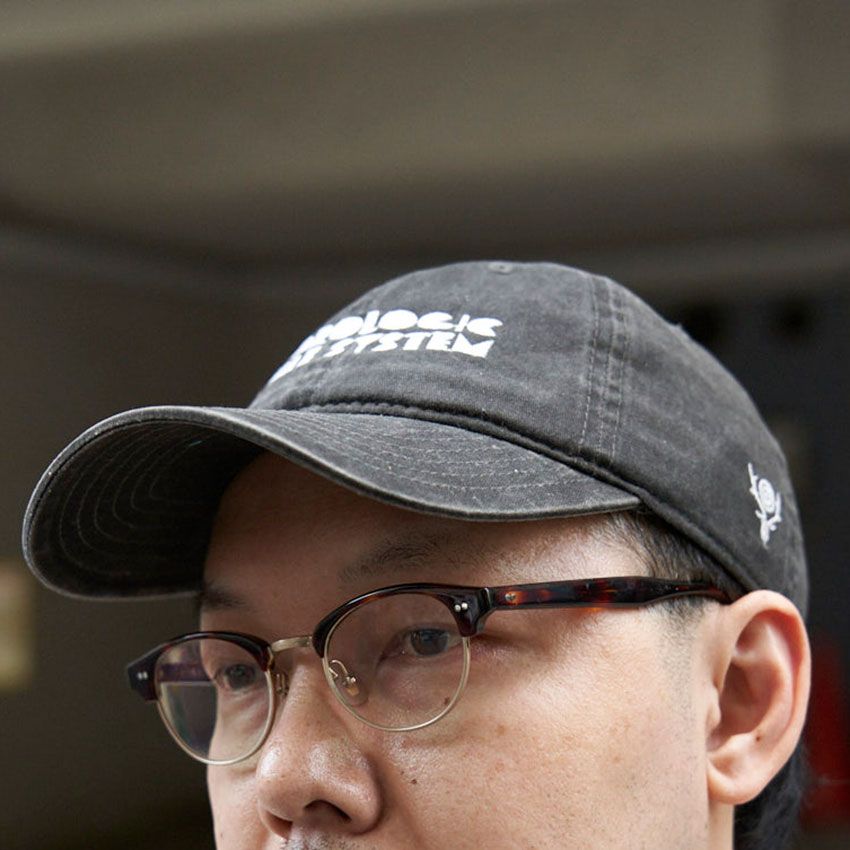 肝心のキャップは、パンツと質感&カラーを揃えたブラックデニム製のストラップバック。ブランドお馴染みのフォントデザインが、左胸のロゴとともに気の利いたアクセントに。