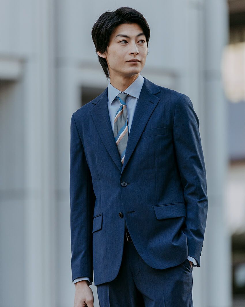 最初に紹介するのは、スリムシルエット。コンパクトなシングル2ボタンのデザインで、かっちりとした印象が際立つ。