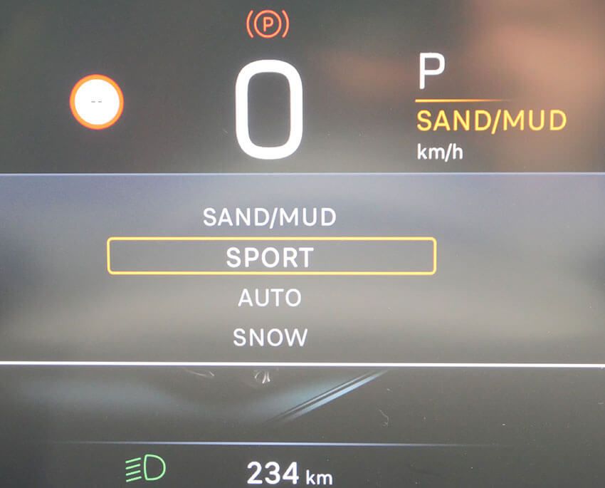 さらに「砂 / 泥」モードでは、時速30kmまでは前後50:50のトルク配分でAWDが作動。低速域でしっかりとした駆動力を確保できるため、ぬかるみからの脱出などではこのモードが安心できると感じた。