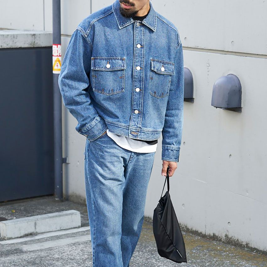 男の定番であるGジャンとデニムパンツの組み合わせを、エヌハリウッドのセットアップで現代的にアップデート。インナーには無印良品のスウェットなどリラックスしたアイテムを挟むことで、全身ブルー特有の緊張感を程よく和らげている。