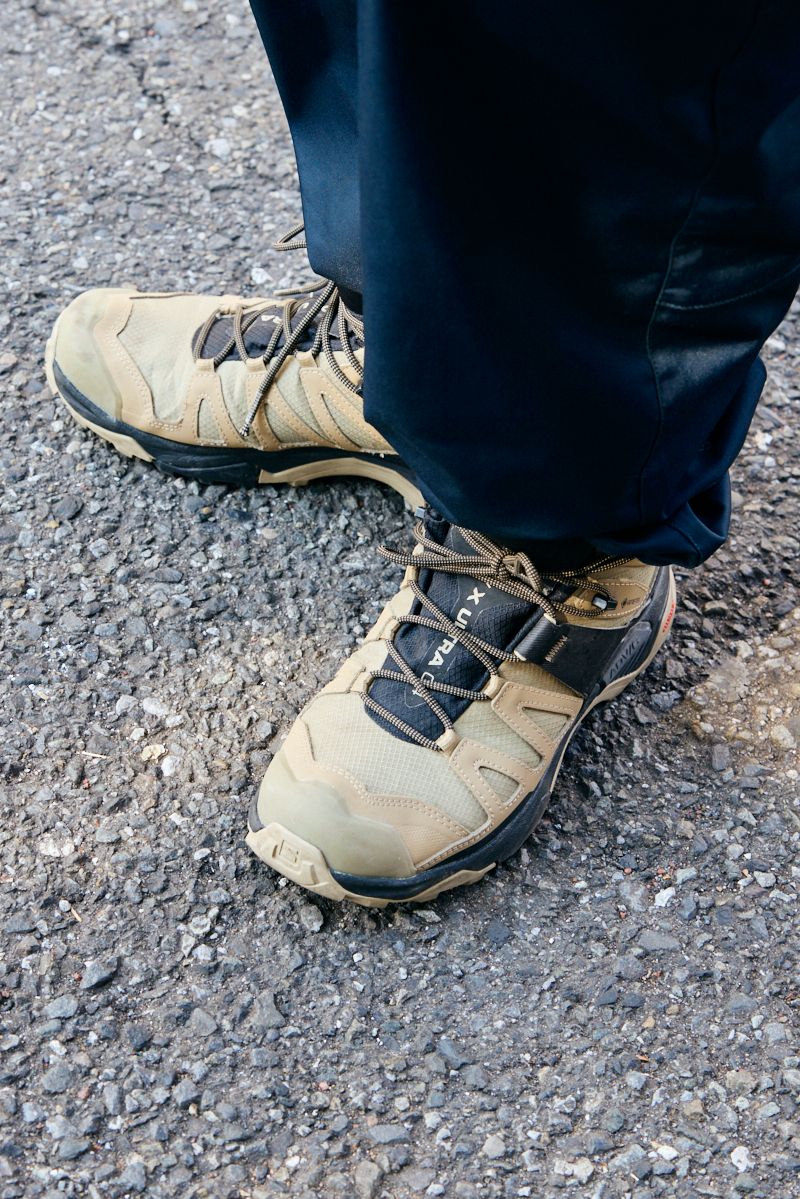 足元のサロモンがアクティブなムードを加速させつつ、全体のトーンを壊さない見事なバランス感覚。休日の街歩きに最適なスタイルだ。