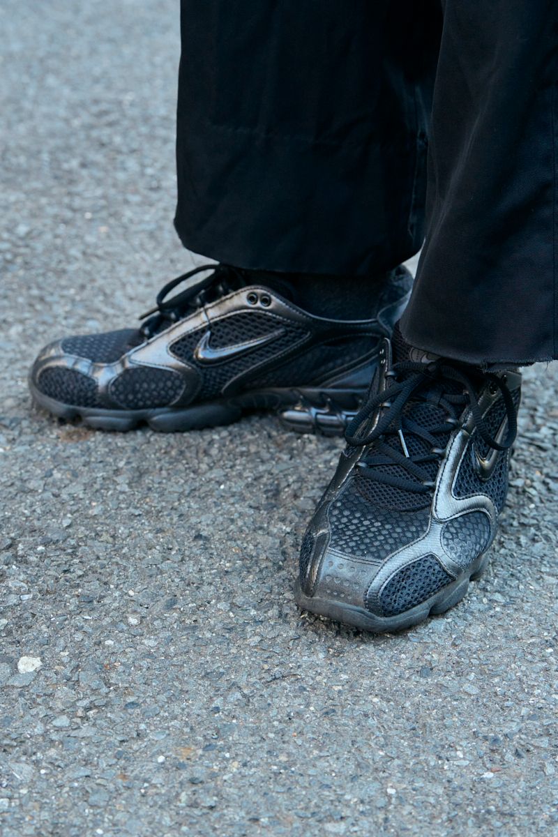 ▶︎ダンヒルさんのスナップをすべて見るダンヒルさん(44歳)ノーブランドだという短丈のレザーブルゾンを、ジョルジオ アルマーニのワイドパンツでドレッシーに昇華。あえてインナーにアディダスのスウェットを挟むことで、40代らしい「遊び心」と「軽快さ」を演出している。足元はナイキの「エア ズーム スピリドン ケージ 2」でスポーティにまとめつつ、グッチの眼鏡で顔周りに知的なニュアンスをプラス。ブランドのネームバリューに頼りすぎない、審美眼が光るMIXスタイルだ。