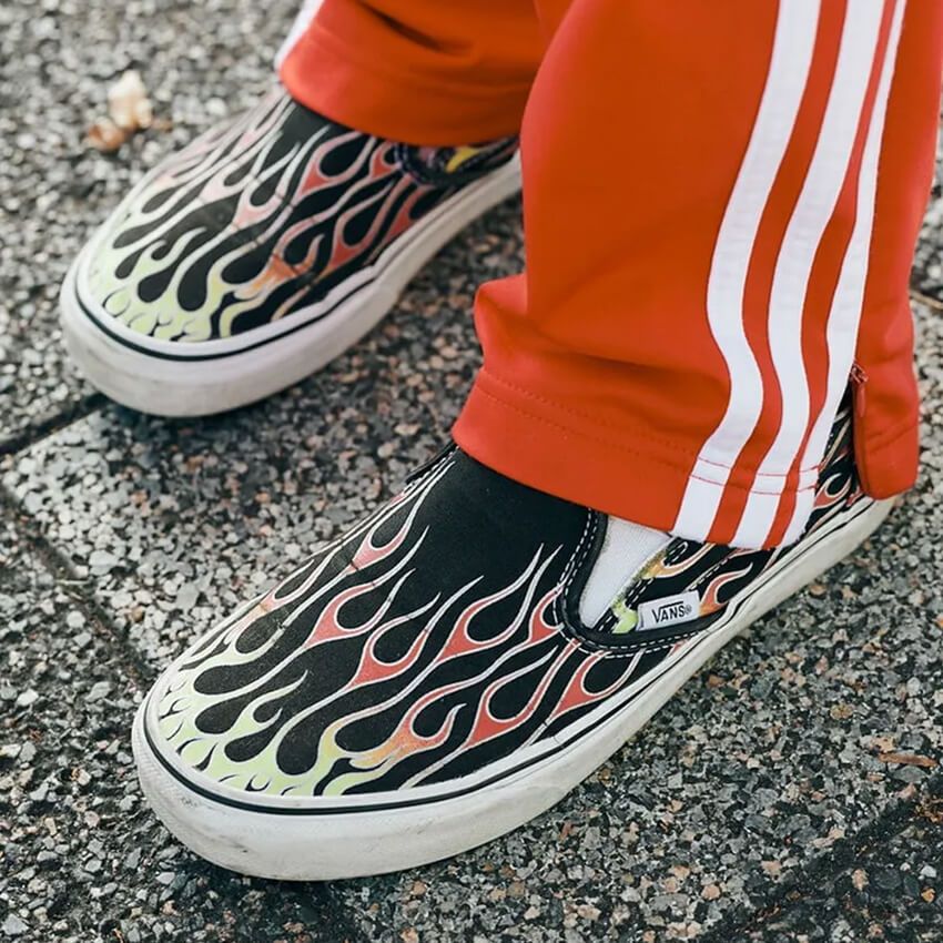 で、足元はスリッポンのファイヤーパターン。パンツのカラーを一部で拾いながら、全面の柄はトップスともリンク。つまり、スウェット・オン・スウェットかつ柄オン柄。洒落てる。