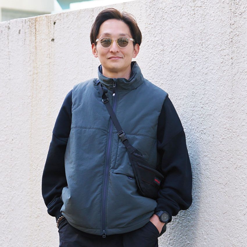 ▶︎岩田さんのスナップをすべて見る岩田篤幸さん(38歳)ネイビー&ブラックのミニマルな色彩を、ナイロンベストを使った潔いレイヤーで構築。ベストとニューバランスで揃えた靴のほか、時計やバッグもしっかりトンマナを揃えている。