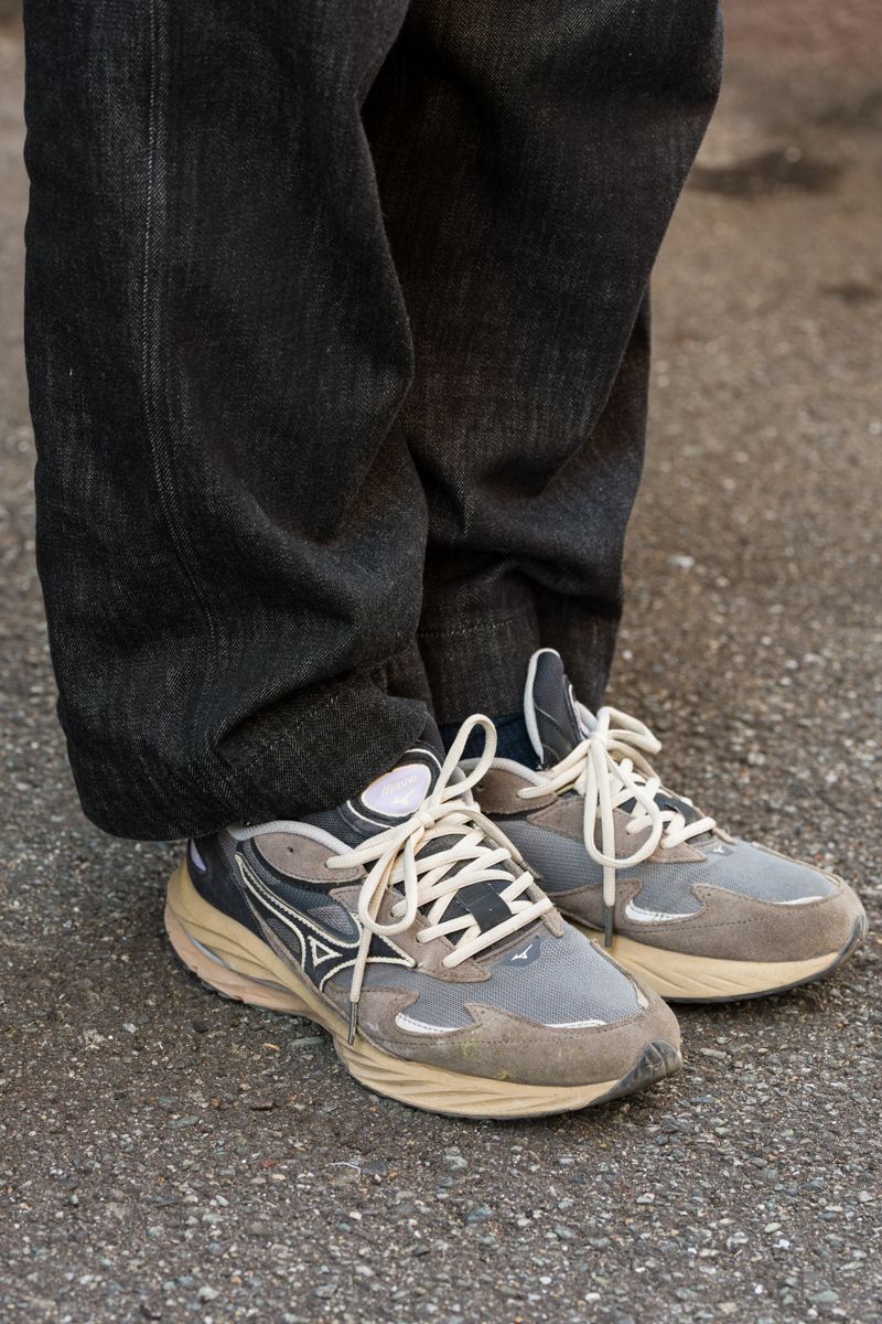 ベスト=カリフォルニア ニット=古着 デニム=ガンホー シューズ=ミズノ