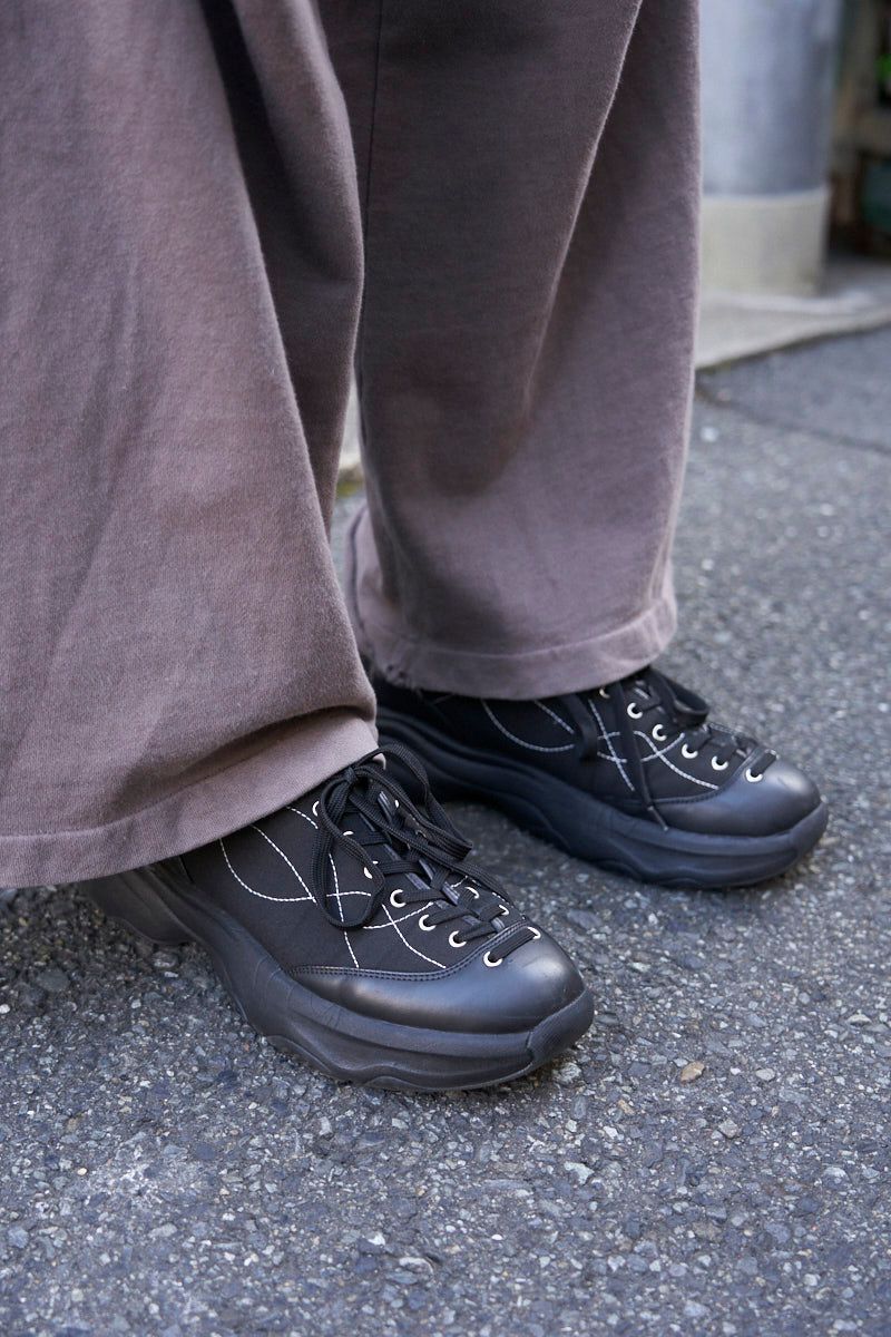 スウェットパンツのテクニカルなフレアシルエットが落ち着いて見えるのも、アーシーな色使いゆえ。かといって全身モノトーンのシンプルさには逃げない、果敢な姿勢も好印象。