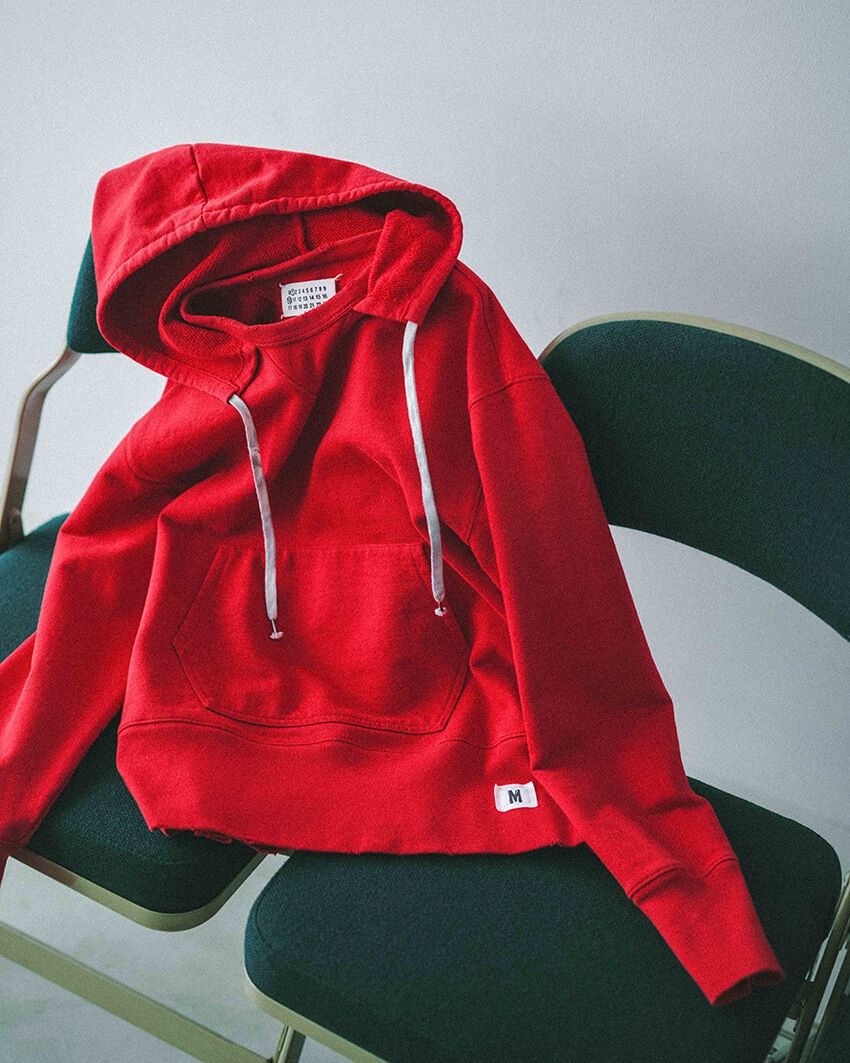 クルーネックに後付けされたフードや長めのリブ使いなど、クラシックな意匠が際立つ「メゾン マルジェラ」のスウェット。発色の良い赤は、陽気な気候に合わせて気分も上げてくれる。