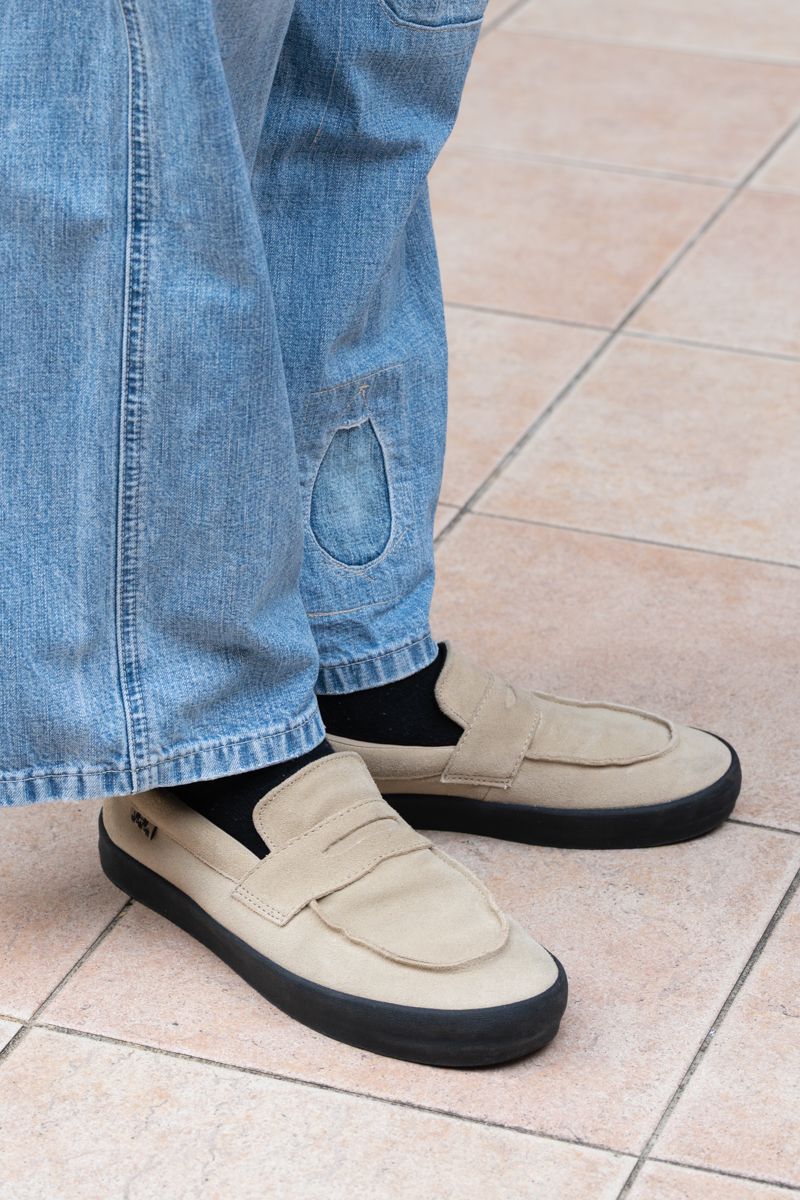 ▶︎高橋さんのスナップをすべて見る高橋晃麻さん(25歳)薄く色落ちしたデニムにパッチを当て、センスフルに個性を上書き。“らしい”仕上がりを見せるポータークラシックの1本に、ベージュのローファータイプを寄り添わせた。