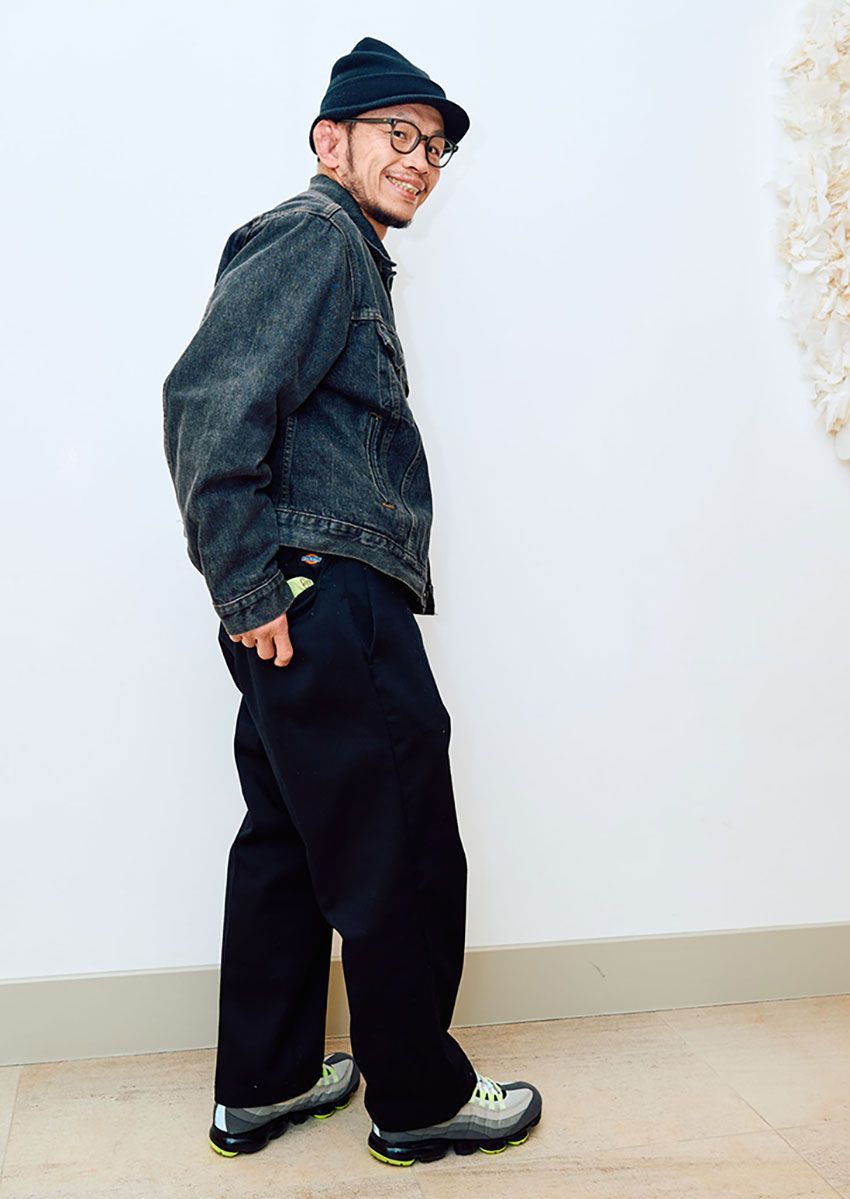 古着のディッキーズを巧みに穿きこなして登場した宇野さん。リーバイスのGジャンにアメリカ製のディッキーズを合わせた王道のアメカジスタイルだが、足元の「ナイキ エア ヴェイパーマックス 95」がアクセントとして効いている。