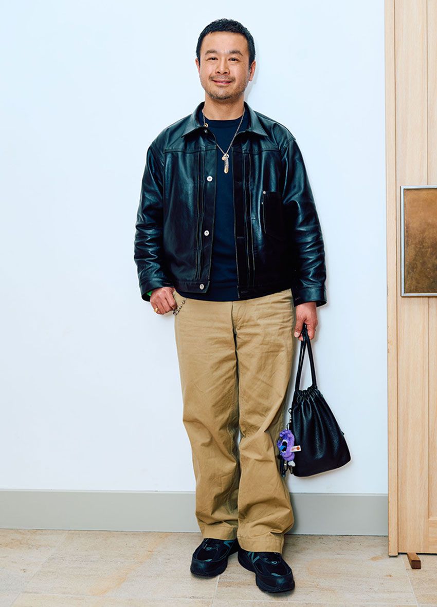 デニムの第一人者として知られる藤原さんだが、この日はベージュのワークパンツをセレクト。自身が手がけた重厚なレザージャケットと合わせ、普段のデニム姿とはひと味違う、武骨ながらも品のある大人の装いを披露してくれた。