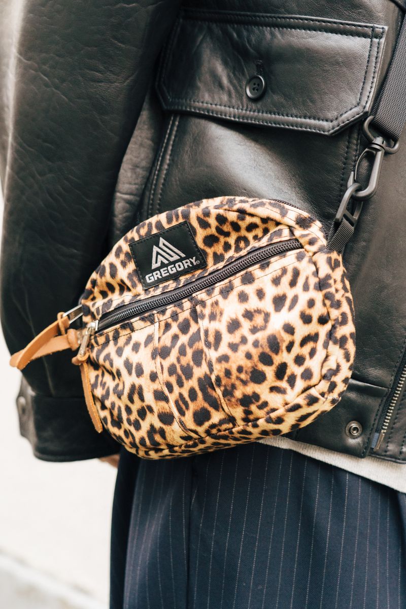 ④ 洗練されたレザーセットアップに、機能的なアウトドア小物を