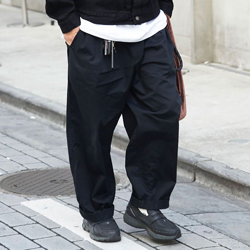 ワコマリアらしい黒ジャケットを羽織りつつ、ボトムスには黒ユニクロのパンツを指名。この計算された引き算が、街に馴染むクリーンなブラックスタイルを構築している。