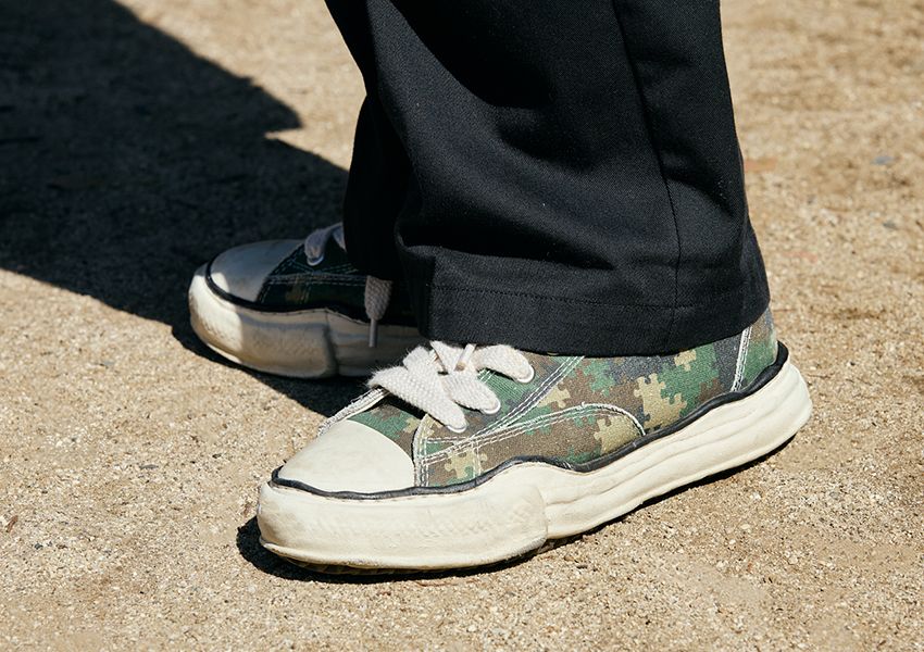 足元を支えるのは、ボリューミーなソールにパズル形のカモ柄が特徴的なスニーカー。メゾン ミハラヤスヒロと、知り合いのブランドだというピース アンド アフターのコラボ作が、全身ブラックの装いにリズムを生んでいる。