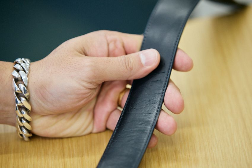 「このベルトは仕事の衣装にも使うんですが、収録現場だとピンマイクの受信機をつけるときに傷が付くんですよ。普通なら嫌かもしれませんが『こんな傷がつくのは、この仕事だからこそ!』って、逆に喜んでます。完全に自己満ですけどね(笑)」。