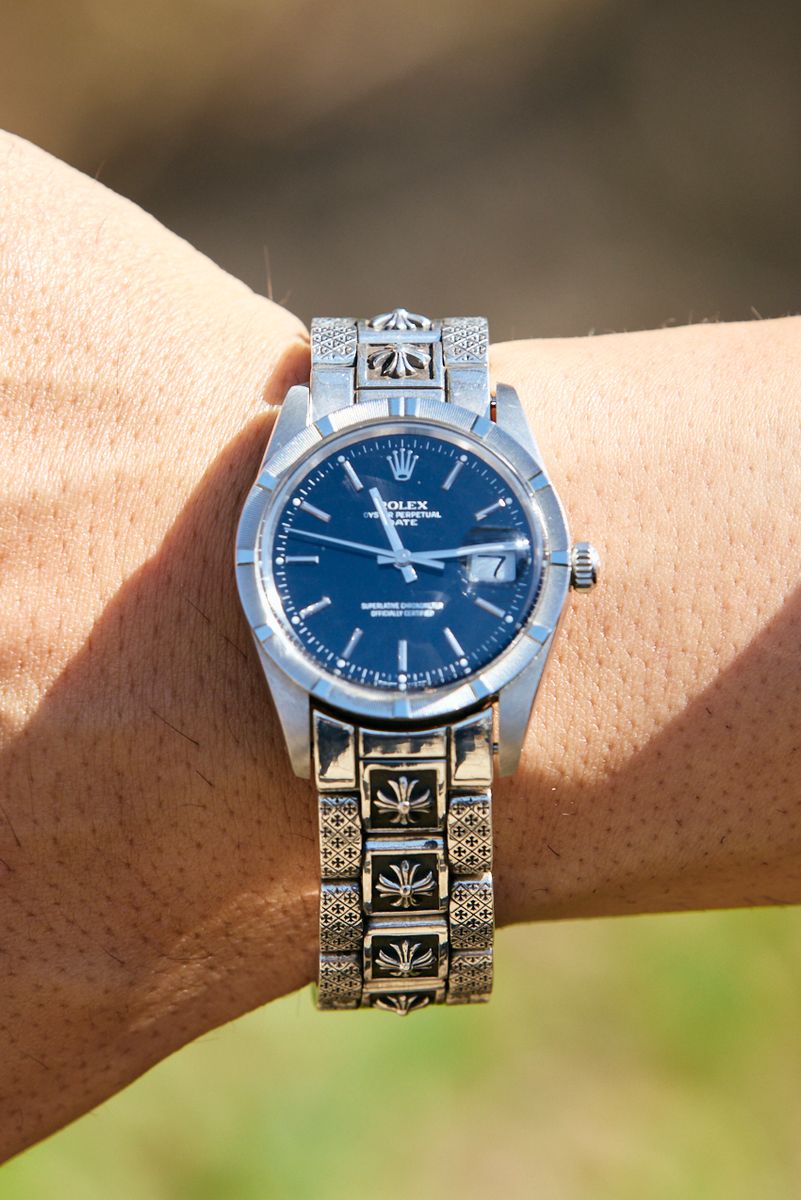 右腕にはロレックスの「オイスター パーペチュアル」が光る。この時計も、自身の生まれ年である1987年モデルをクロムハーツのバンドでカスタムした。