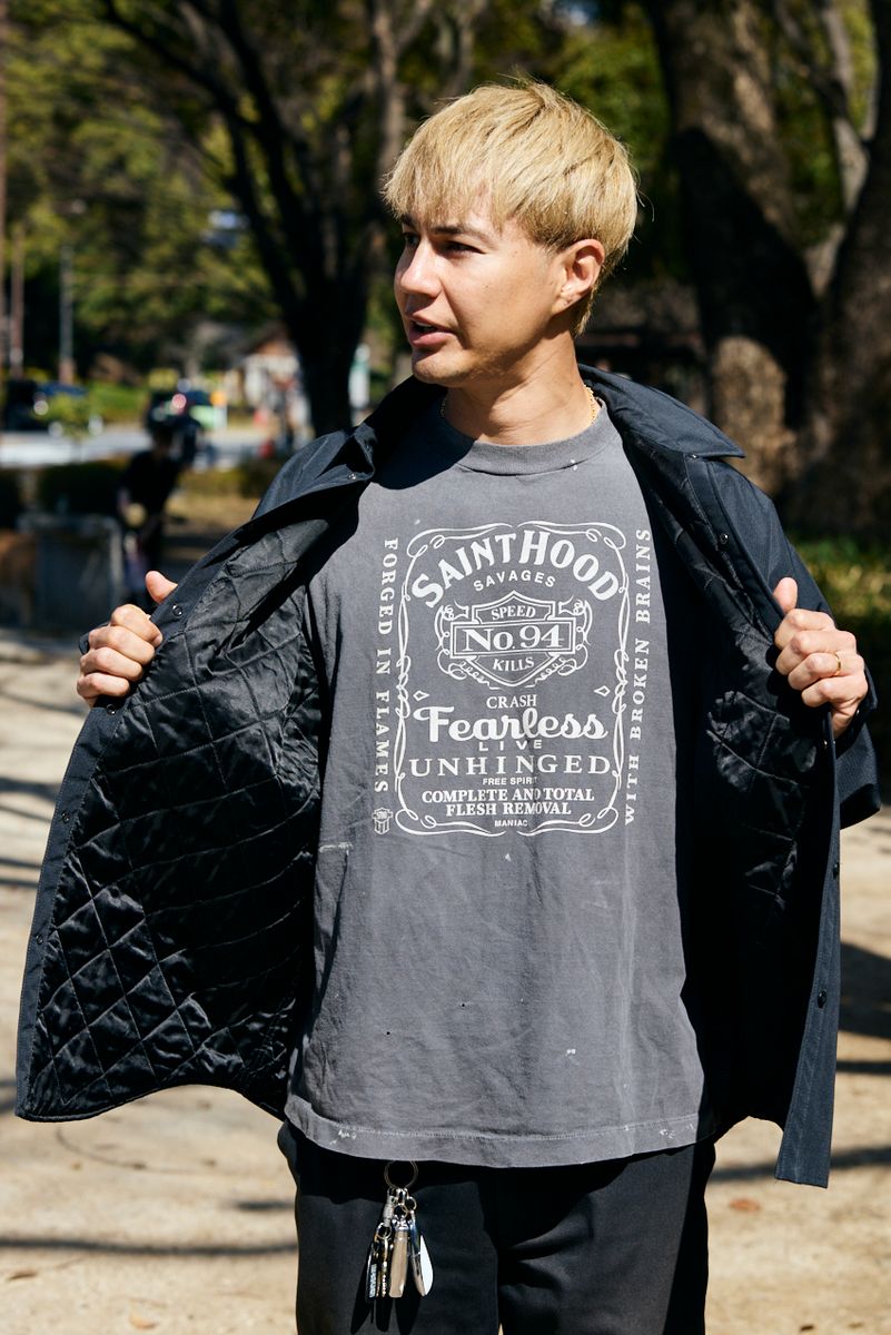 インナーは、ストリートシーンで絶大な支持を得るネイバーフッドと新鋭ブランドのセント マイケルによるコラボTシャツだ。