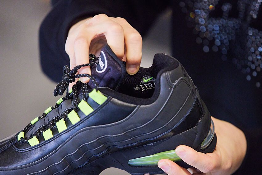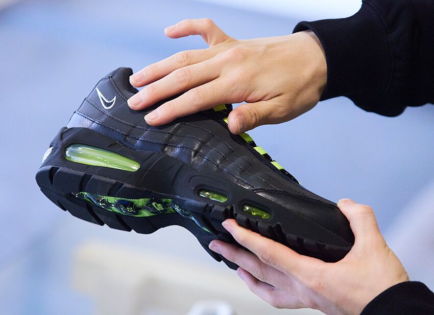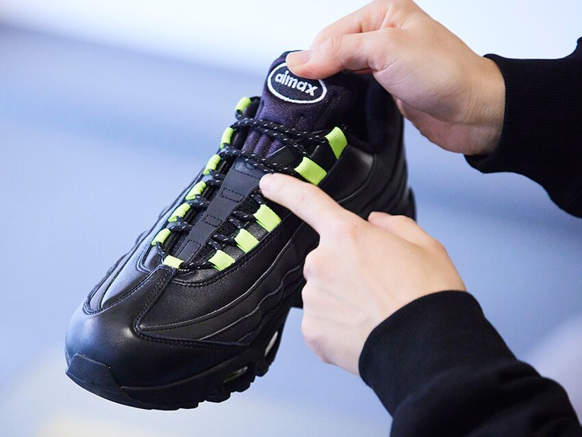 ーーブラックを基調に、ネオンイエローが映える。まさに95らしい配色ですね。福田 “原宿の街をイメージした”一足です。最大の特徴はこの内側。シュータンをめくっていただくと……。
