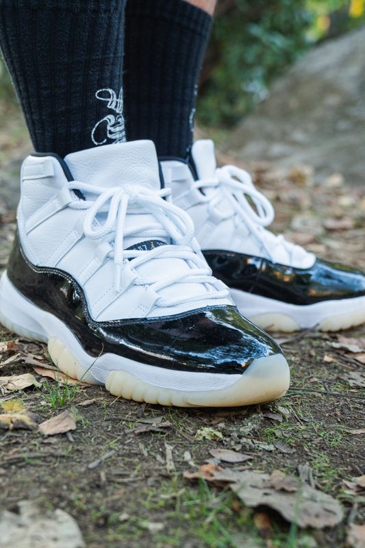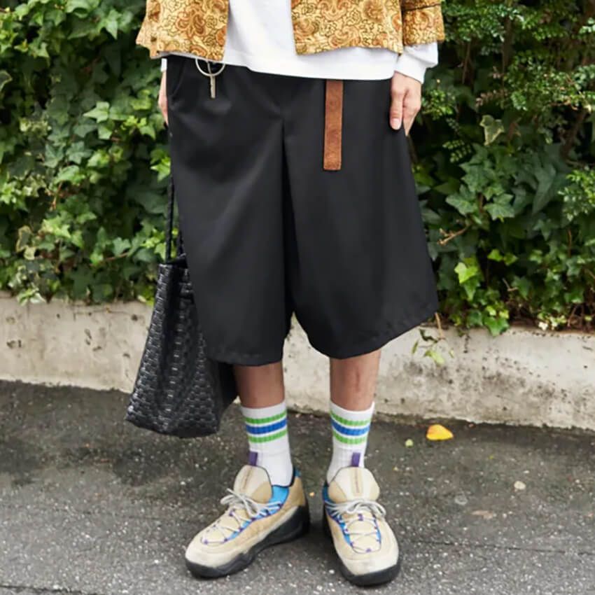 潔いトップスに対し、足元のジョーダン ブランドのスニーカーが主役級の存在感を放つ。迷彩ショーツを合わせることで、ボリュームのあるスニーカーの力強いフォルムがより一層引き立っている。