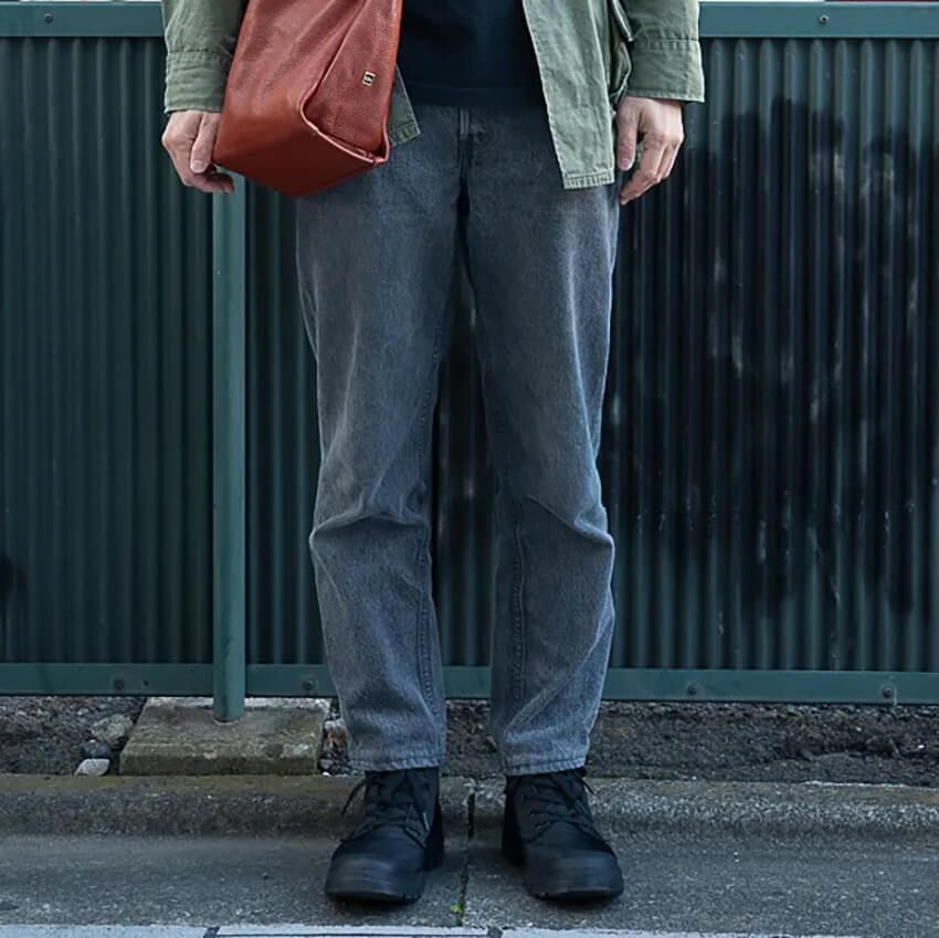 ① 王道スリムデニムに、機能的なシューズを合わせる
