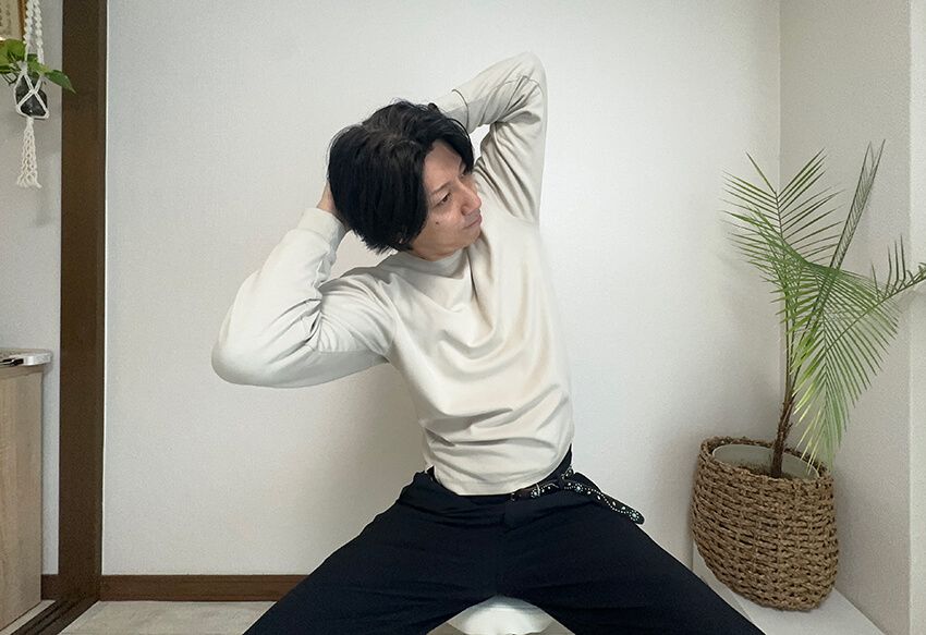 (3)右側の肋骨でも(1)~(2)を実施する肋骨ストレッチは、立った状態より座って行う方が、上半身の動きに集中しやすいため効果が得られやすいです。肩だけをひねるのではなく、上半身を一枚板のようにひねって、体幹を意識しながら動かしましょう。