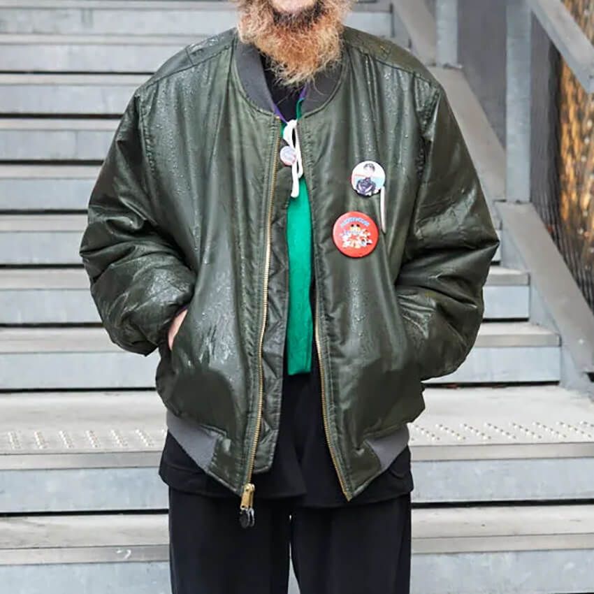 ▶スナップをすべて見るミリタリー特有の武骨さを削ぎ落とした、都会的なフライトジャケット。その下に“トゥモロー”のジャケットを重ね、既成概念に縛られない自由なレイヤードスタイルを構築した。