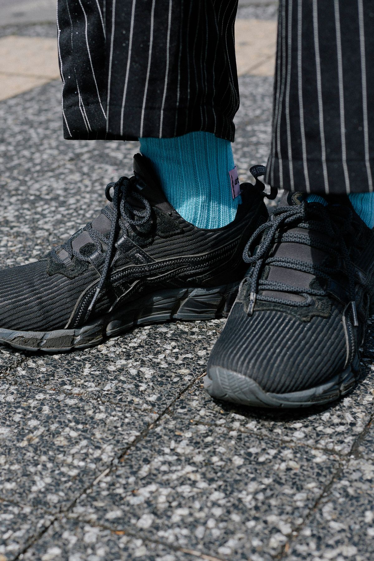 この多層的なスタイルを、バラバラに霧散させず足元で強固に繋ぎ止めているのがアシックスのオールブラック。あえて構造的な一足を選ぶことで、装い全体に奥行きをプラス。装飾を楽しみながらも、足元には揺るぎない屋台骨を据える。その冷静な判断こそ、洒脱の決め手。