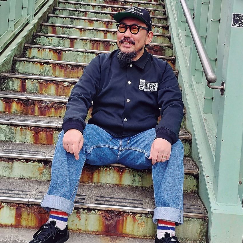 デニム=古着 ジャケット=ライト デイリー パースペクティブ スウェット=ロンハーマン アンダーアール スニーカー=アディダス ニットキャップ=ラカル