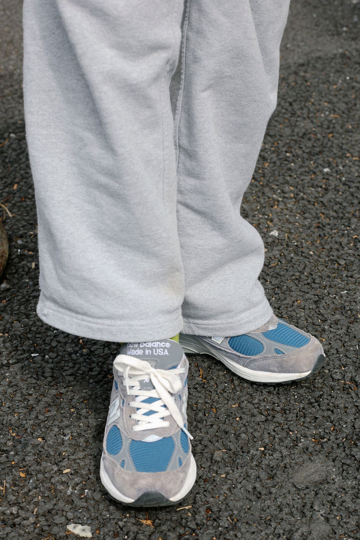 上下スウェットという、最も難易度の高いセットアップ風の着こなし。ここで久保井さんは、トップスにオーラリーの極上スウェットを投入した。一目で質の良さが伝わる一着を合わせることで、ユニクロのスウェットパンツと相まって全体がクリーンにクラスアップして見える。