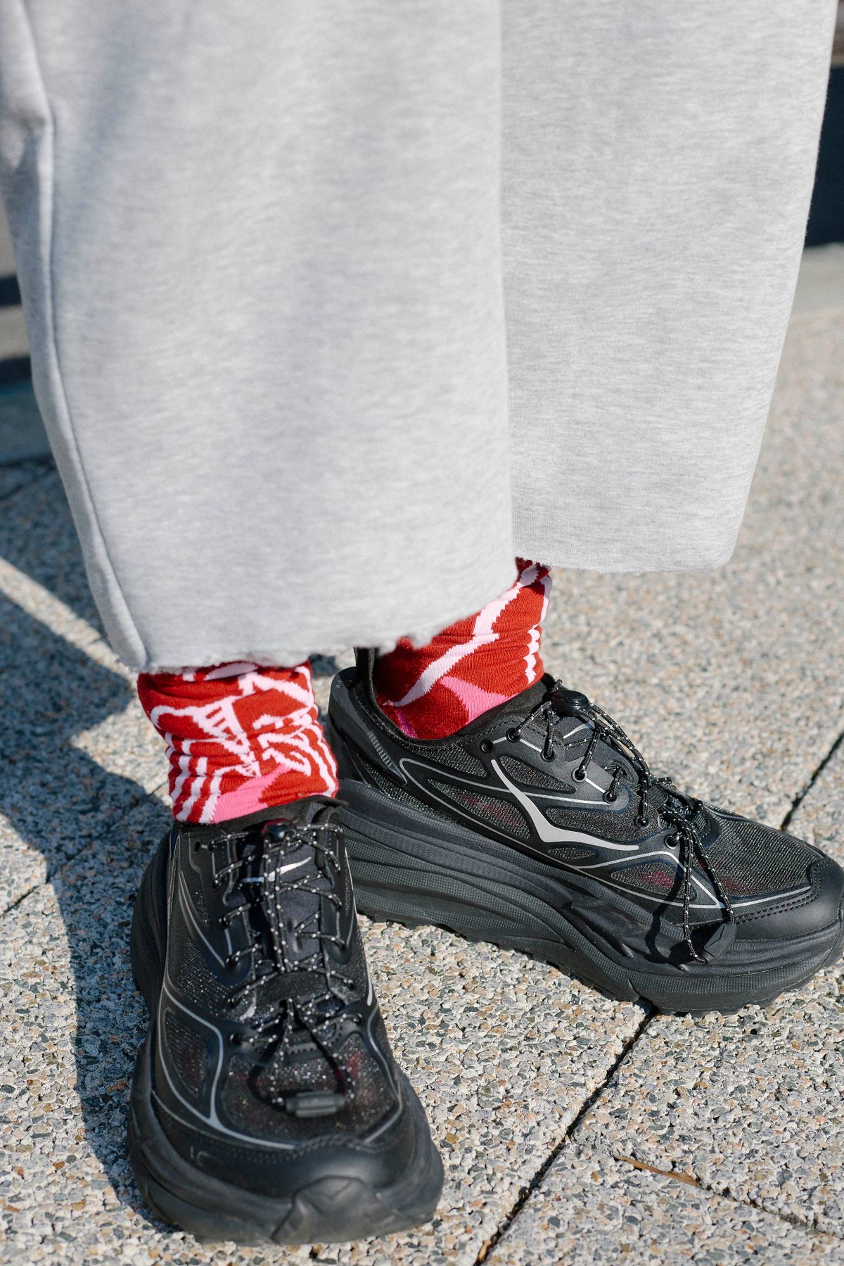 ユニクロのベーシックなスウェットパンツを、どう「外着」として昇華させるか。むらさんの解答は、あえて裾をカットオフにするという大胆なアレンジだ。スウェット特有の足元の“溜まり”をなくし、ホカの厚底スニーカーへ流れるようなラフなシルエットを構築。