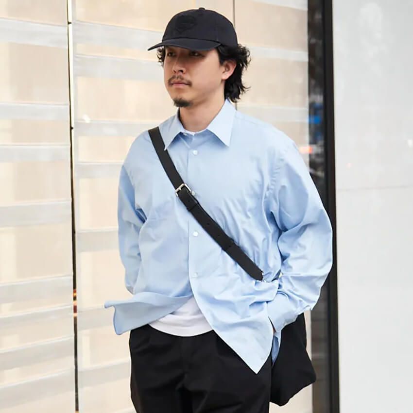 ▶しゅうへいさんのスナップをすべて見るしゅうへいさん(26歳)オーラリーの淡い水色のシャツを主役に据えつつ、その他のアイテムをすべてブラックで統一した潔いスタイリング。パンツからシューズ、さらにはヒューマンメイドのキャップやバッグに至るまで黒で引き締め、シャツの柔らかな色味と上質な素材感をより際立たせた。