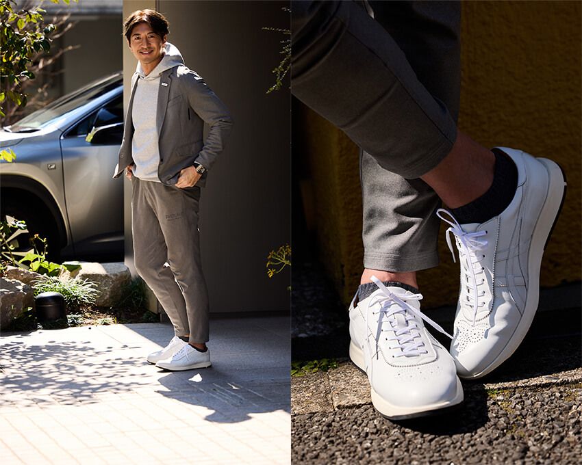その点、今回のスニーカーは、そんな私のファッションに対する思考にすっと寄り添ってくれます。例えば出張先。急遽格式の高い場所に行くことになったとき、靴選びが悩みの種なんですよ。でもこのドレススニーカーは、上質な革が放つ品の良さがあり、そのやわらかさから履き心地も良好。そしてなにより軽く、加えてパーフォレーションで魅せるちょっとした洒落っ気まで備わっている。いわゆるラフなスニーカーとは違いますよね。それでいてフォーマルなビジネスシューズとも違う。絶妙なバランス感をもった一足だと感心しました。