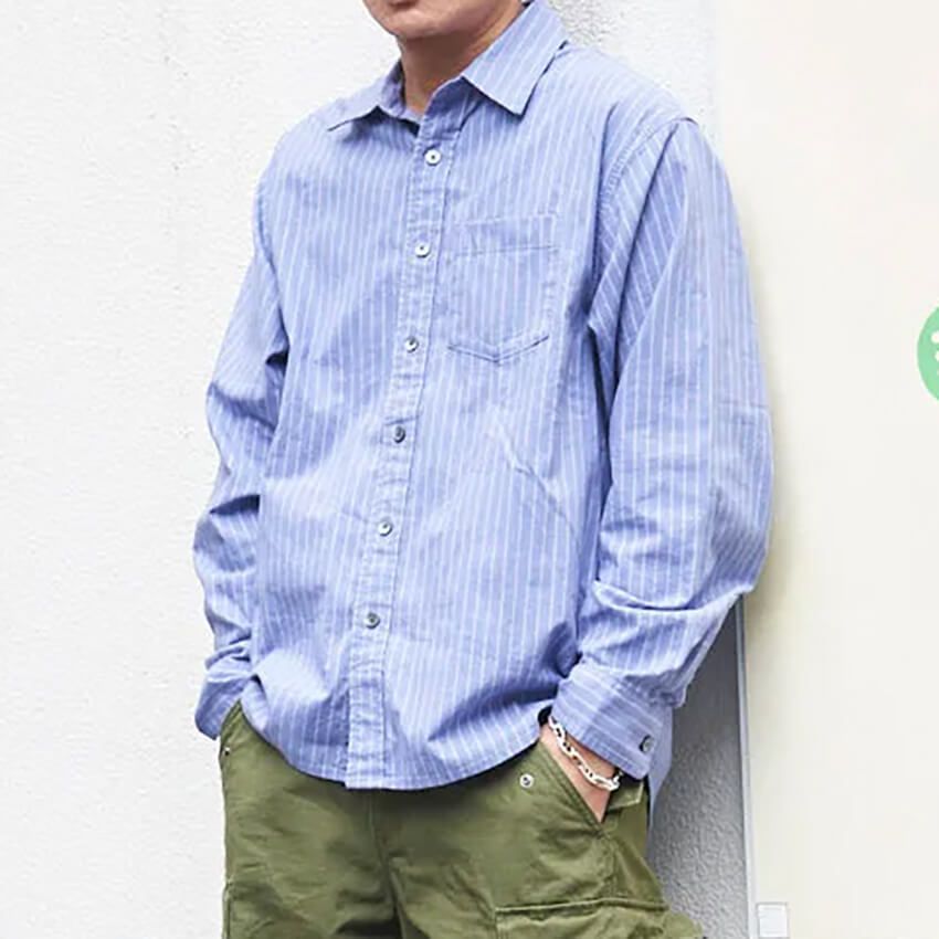 ▶てっぺいさんのスナップをすべて見るてっぺいさん(46歳)カフスボタンもしっかり留めて、ビッグなストライプシャツをしっかり着る。カーゴパンツもにステューシー、そんなブランドチョイスも相まって大人ストリートを香らせる。