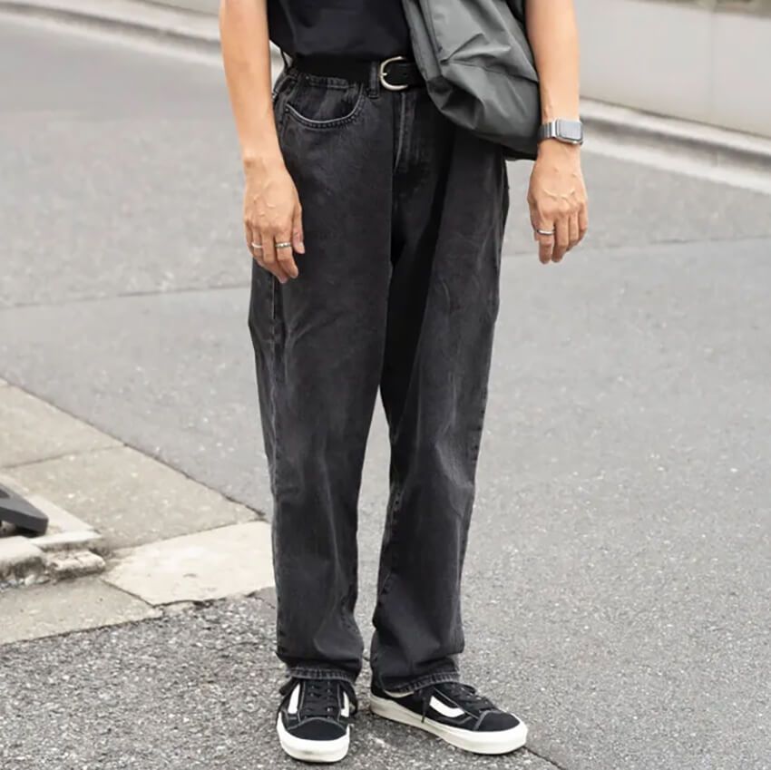① ウエストマークとデニムのフェードで黒一色を立体的に