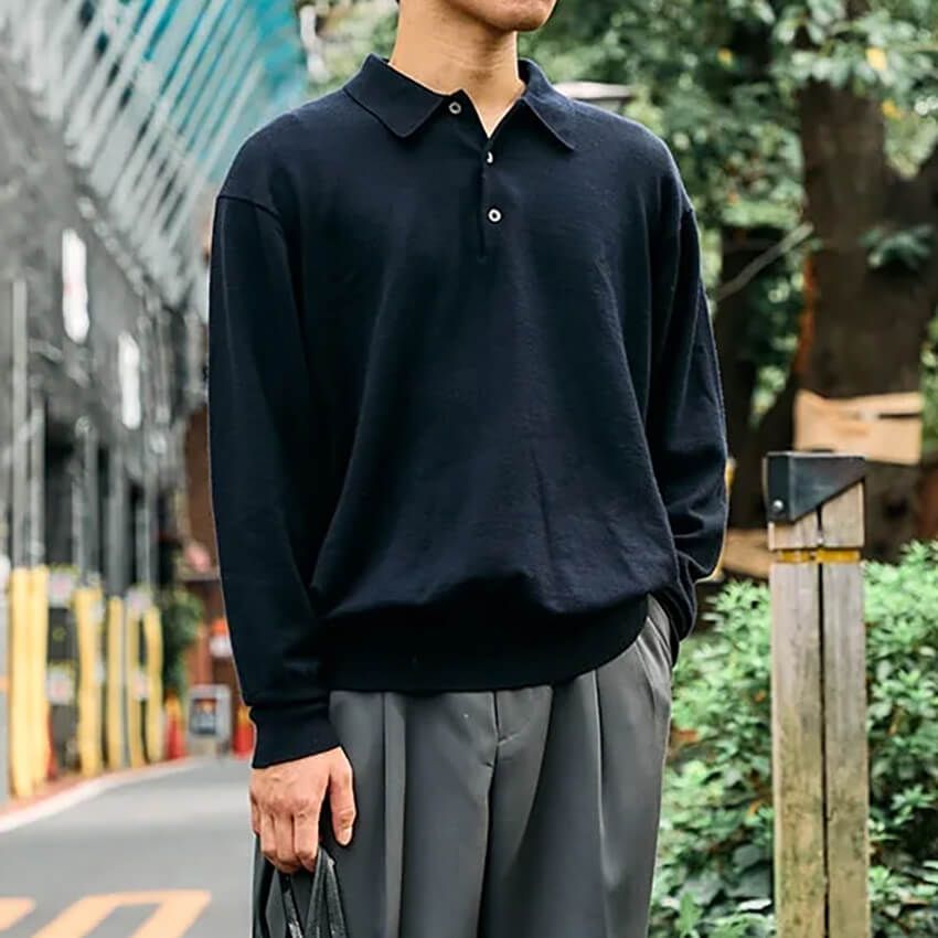 ▶室橋さんのスナップをすべて見る室橋昂希さん(25歳)上質な日常着を提案するアプレッセのポロシャツを、一枚でさらりと着こなしたクリーンなスタイリング。ボトムスにはオーラリーのパンツを合わせ、素材の美しさを前面に押し出したミニマルなアプローチが素晴らしい。