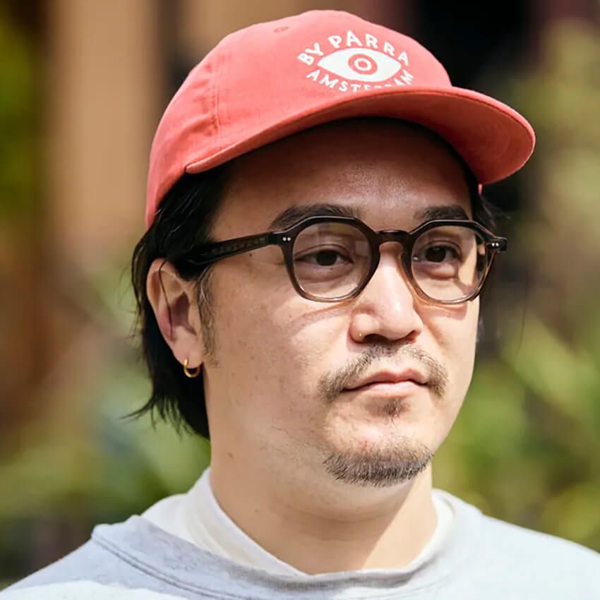 シンプルにスタイルを語る軽装の結びに、個性的な顔周りを。オランダ初のストリートブランドによる赤いキャップが、クラシカルなクラウンパントゥのメガネと粋な調和を見せる。