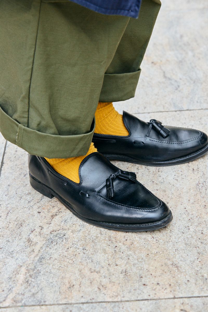 特筆すべきは足元のテクニック。アレンエドモンズのタッセルローファーとパンツの裾の間から、マスタードカラーの靴下を覗かせ、ダークトーンの装いに春らしいアクセントをプラス。古着の枯れた空気感を、現代的なボリュームと絶妙な挿し色で見事にアップデートした好例だ。