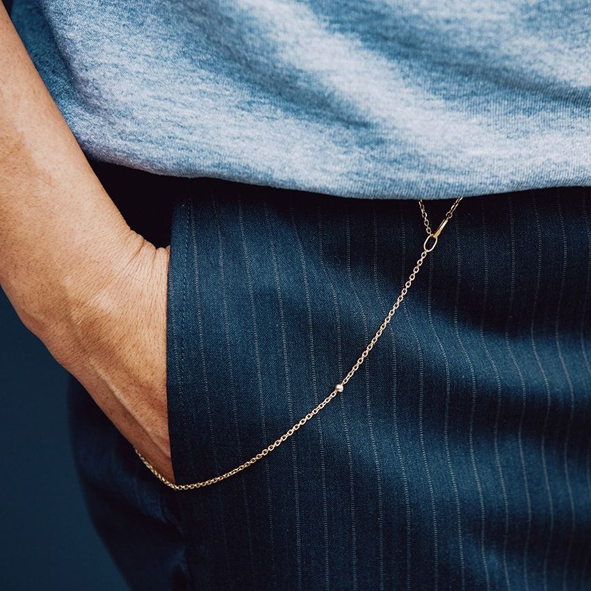 繊細かつ存在感のあるゴールドのウォレットチェーン。「シンプルスタイルに品と奥行きを加えるお気に入りです」と語るこちらは、ハワイ・カウアイ島にルーツを持つ「ヨイ イキニ」製。