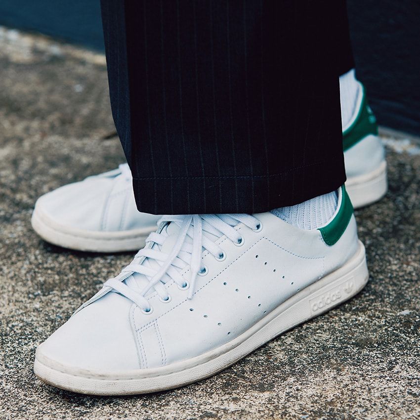 王道コートシューズのスタンスミスがコンフォートに進化したモデルを抜擢。「最近のお気に入りで、ブラックカラーも購入済み。きちんと時流に沿ったアップデートに、深く納得させられます」。