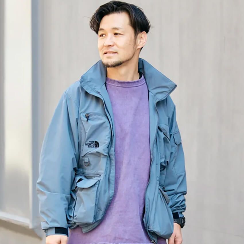 「シャカシャカ系」の代名詞、ザ・ノース・フェイスのジャケットを主役に据えた、機能美溢れるコーデ。アウトドアの出自を持ちながらも、全体を落ち着いたトーンでまとめることで、街に馴染む洗練された佇まいを構築している。