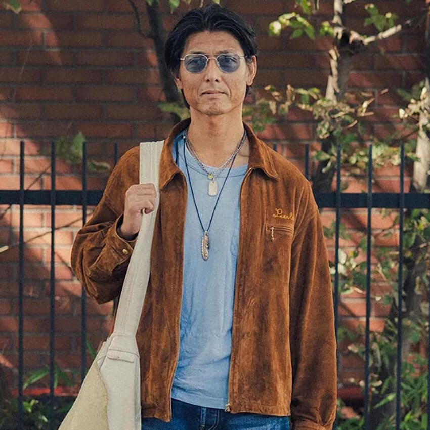 ▶︎立中さんのスナップをすべて見る立中啓悟さん(39歳)「ニードルズ」のスエードジャケット以外のパンツ、バッグ、インナーをすべて「黒」で統一。この潔い配色が、レザーの温かみのある色気を見事に引き立てている。