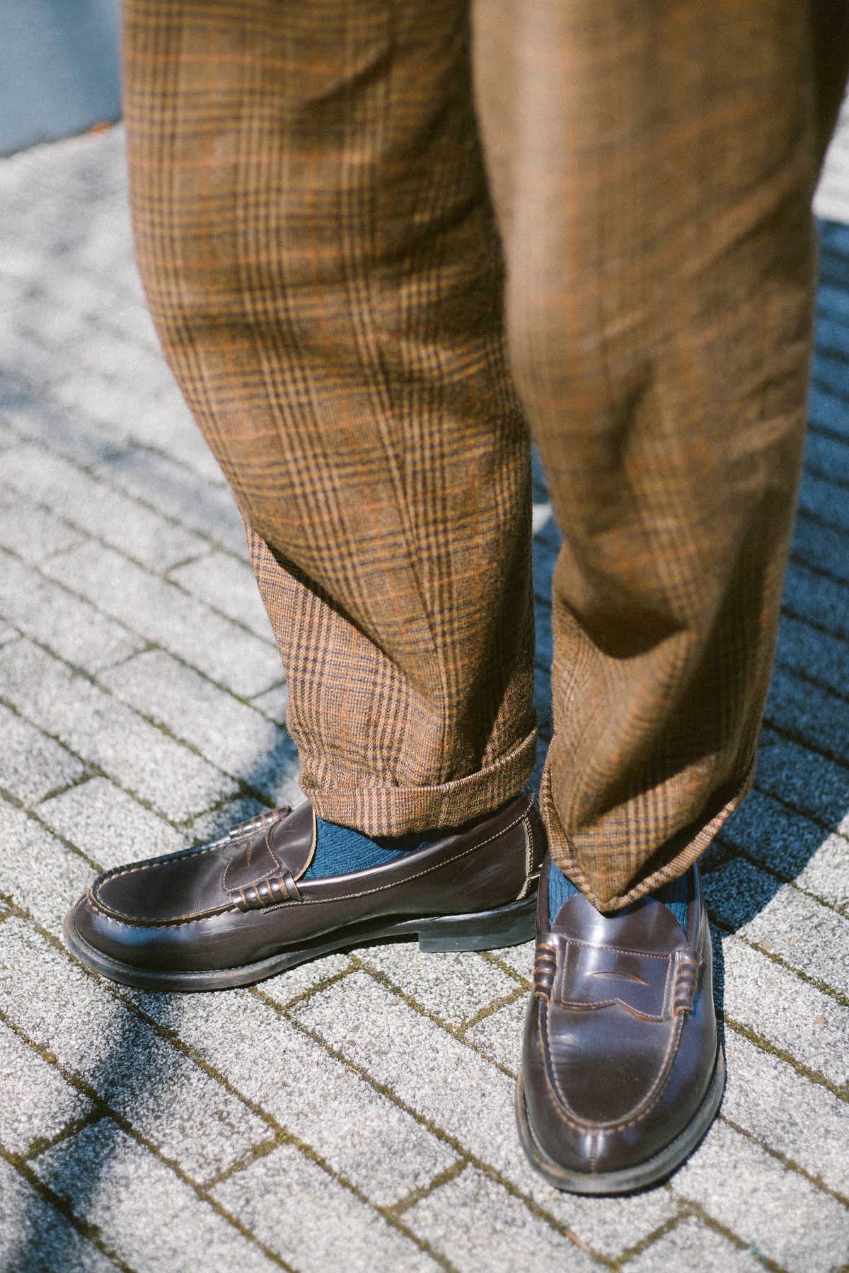 「リーガル」のシューズやオーダーメイドの帽子・バッグを合わせることで、単なる懐古趣味に終わらない、独自のクラシックスタイルを築いている。使い込まれたレザーの質感が、鈴木さん自身のパーソナリティを雄弁に物語る。