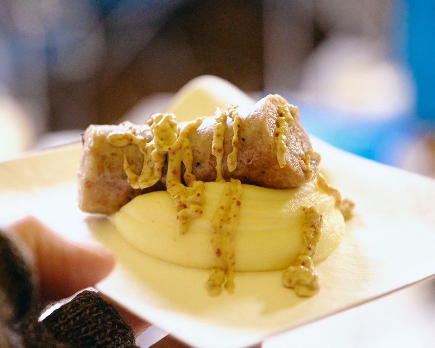 ハード系の牛乳パンにスパイスで煮込んだポークすね肉とピクルスを挟んだサンドイッチ、クスクスとともに味わう鶏肉料理、アップル酒や蕎麦粉、黒胡椒でマリネしたブルターニュ風ソーセージとマッシュポテト。いずれも手間ひまを感じさせる一皿である。