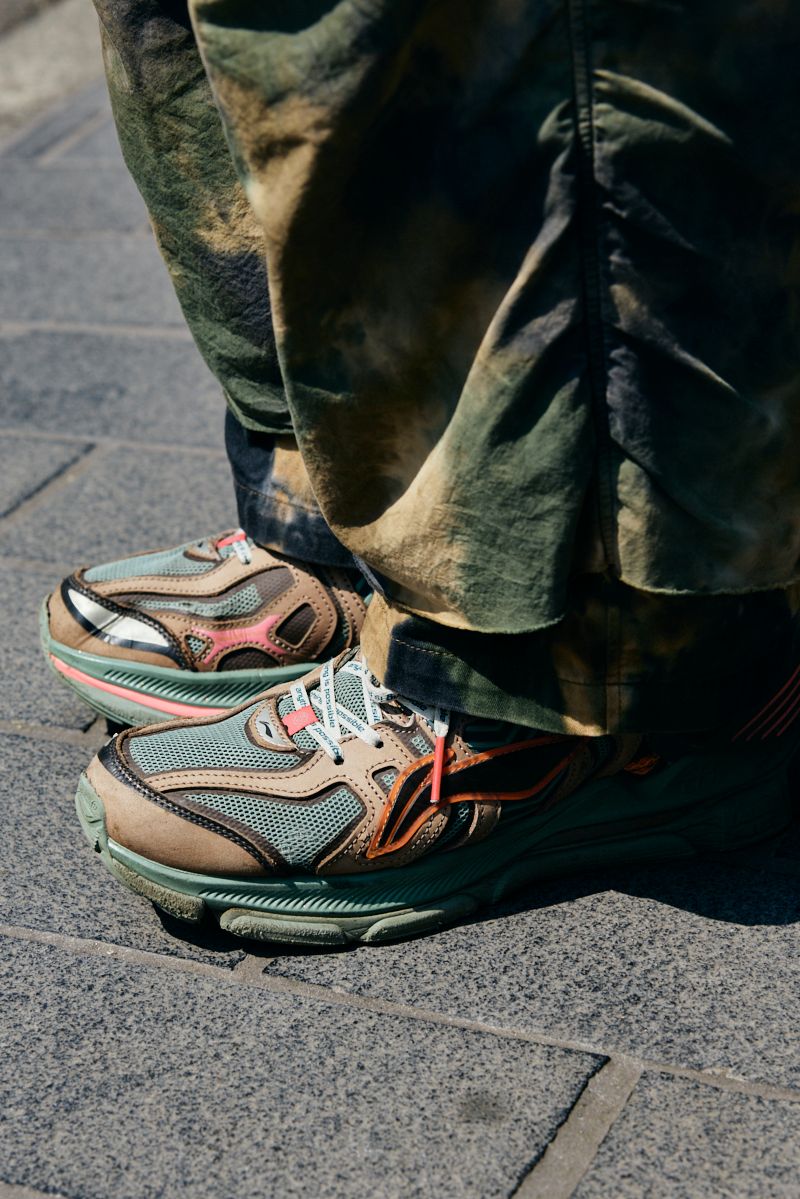 足元にはリーニンのシューズを配置してスポーティな要素を加え、ピークデザインのバッグで実用性も両立。アイテム選びの引き出しの多さがうかがえる。