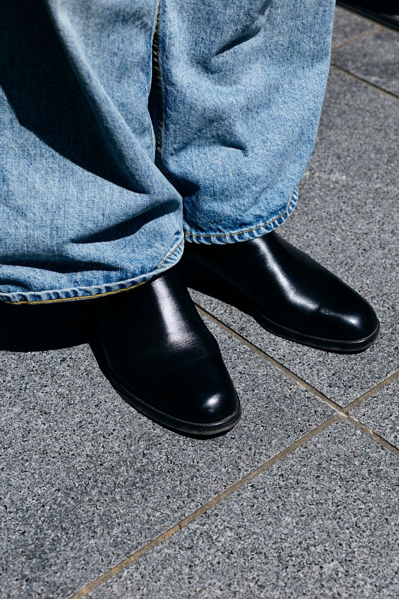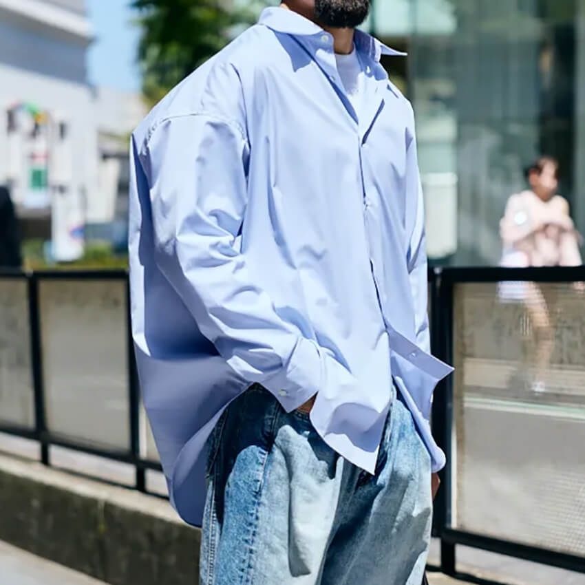 ▶細沼さんのスナップをすべて見る細沼 翼さん(31歳)シャツ、デニムともに「エヌハリウッド」をセレクトし、上下をブルーのトーンで統一。オーバーサイズのシャツ×フレアデニムが、都会的な洗練をもたらしている。