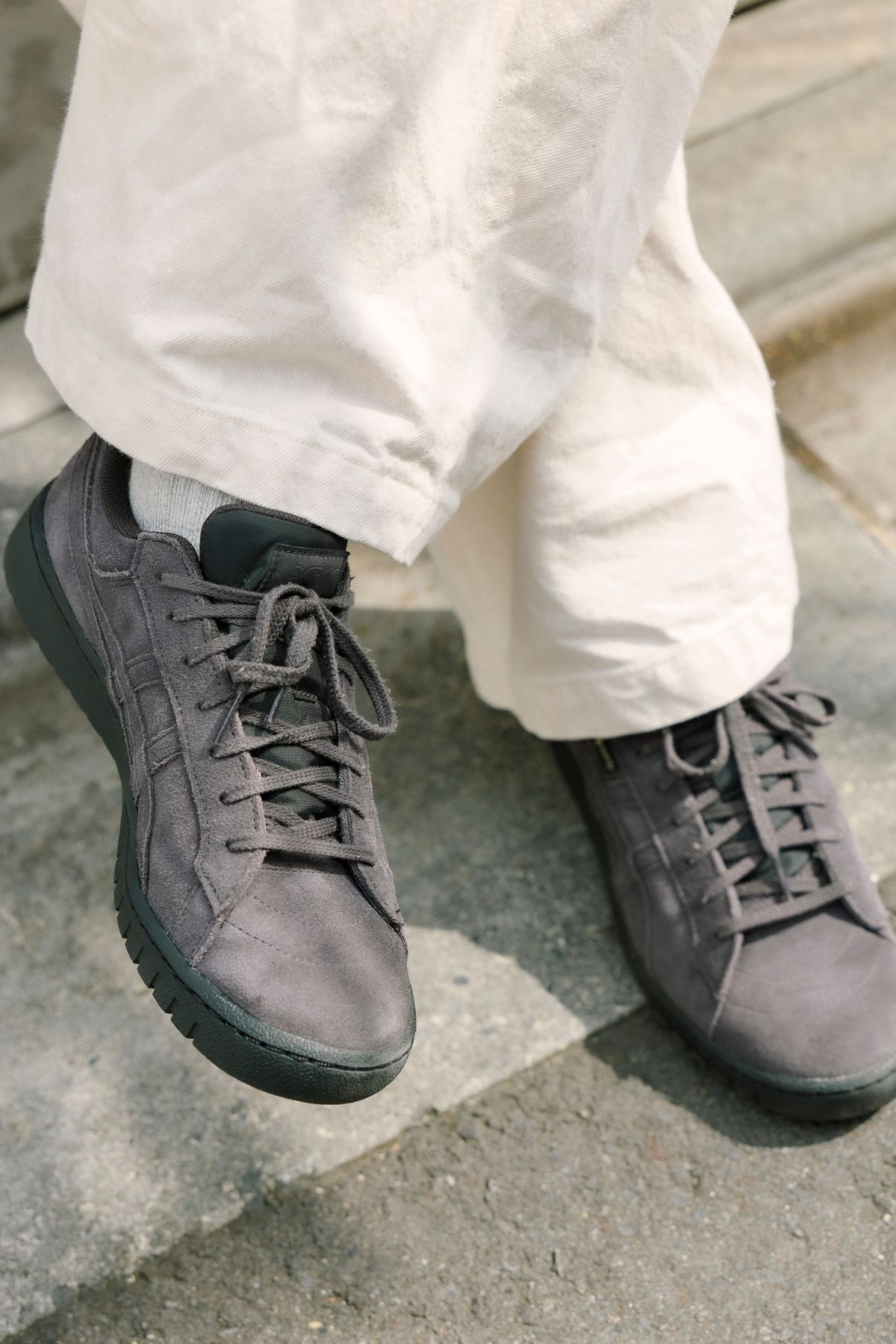 足元は「アシックス」のスエードスニーカーで引き締め、ルノアの眼鏡やメゾン マルジェラのリングで知的なエッセンスをプラス。シンプルだからこそ、アイテムの質が際立つ上級者のワントーンスタイルだ。