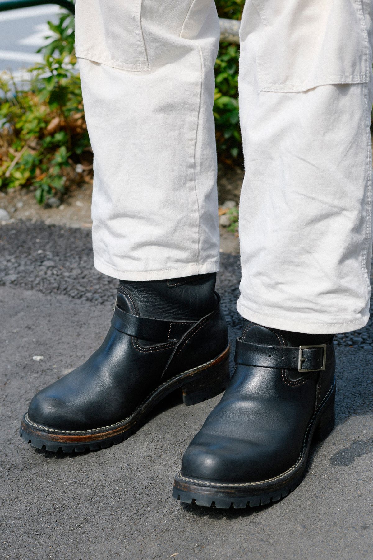 足元はウエスコのエンジニアブーツで重厚に仕上げ、グラッドハンドのカットソーをイン。白をキレイめではなく、使い込んで味を出す“ギア”として解釈した、男気溢れるスタイルの好例だ。